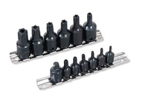 MIT 15-PC. 1/4" AND 3/8" TAMPER STAR BIT features: * Drop Forged, Heat Treated Chrome Vanadium Steel * Precision Machined Bit Tips * Black Oxide Finished for Durability * "Tamper Proof" Star Sockets For Use on Cars, Trucks and Appliances * 6-pc. 1/4" Drive Star Sockets: SD-10, SD-15, SD-20, SD-25, SD-27, SD-30 * 6-pc. 3/8" Drive Star Sockets: SD-40, SD-45, SD-47, SD-50, SD-55, SD-60 * 1-pc. 3/8" Dr. (F) x 1/4" Dr. (M) Adapter * 2-pc. Socket Holders